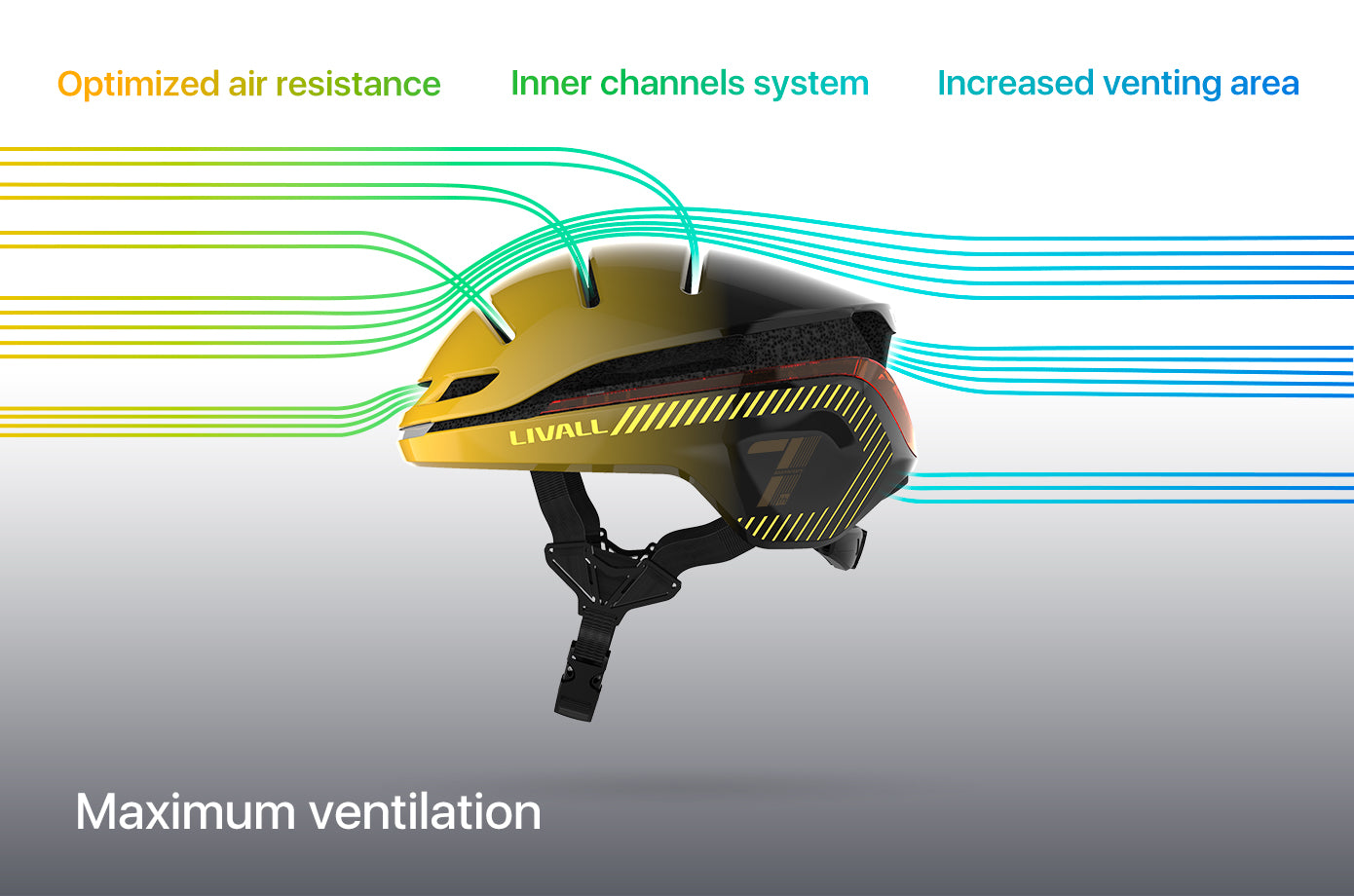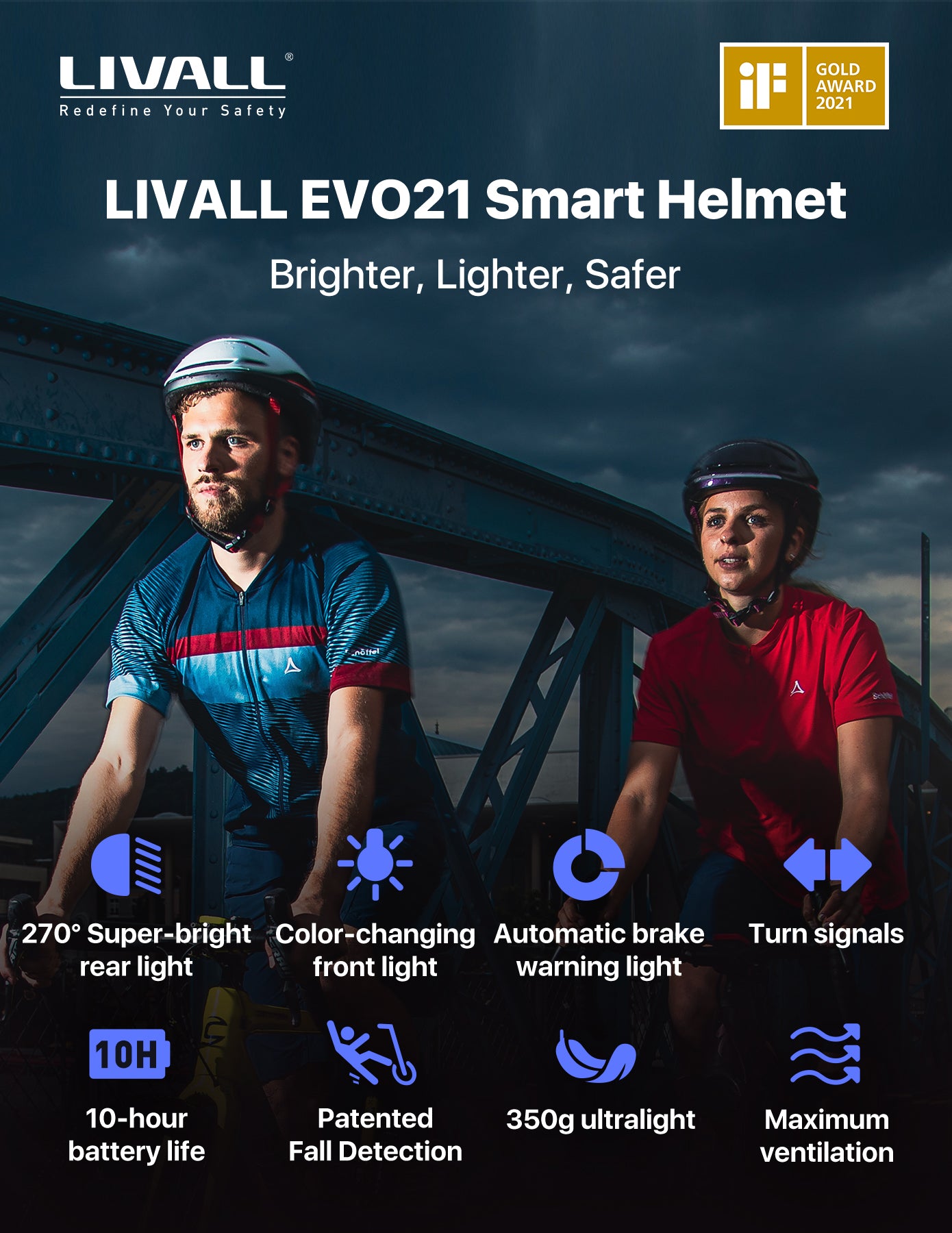 Experience a new way to cycle with LIVALL Helmets, the world's first Smart Helmet. Inspired by real-life bike accidents and founded by enthusiastic cyclists, LIVALL has created a ground-breaking product that enhances all its users' safety and riding experience since its founding in 2014. Winner of the Gold iF Design Award 2021, EVO 21 combines the aggressive aerodynamics and seductive lines of the world of time trial cycling with intelligent, active safety technology that escapes the peloton and goes where others simply cannot. EVO 21 harmonizes a spectacular design with the unique features of a LIVALL smart helmet. LED warning lights combined with SOS fall detection and location alert technology provide superior visibility & confidence for all cyclists.