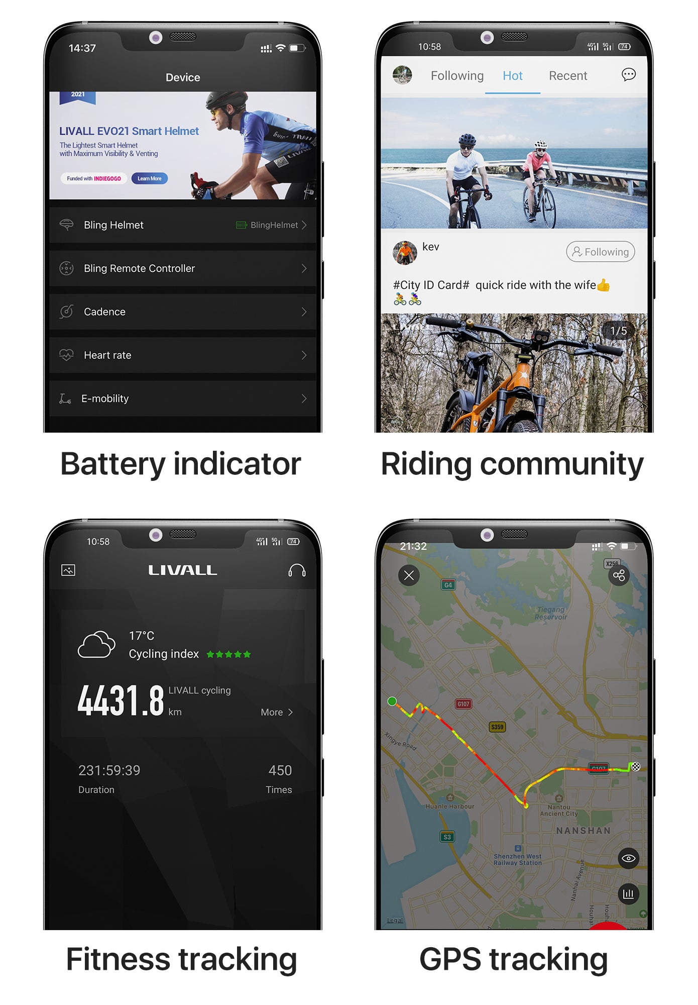 ‣ LIVALL APP | Get the most out of your ride with the LIVALL Riding App. Customize everything from light settings, turn signals, battery reports, and daily cycling records. And the App links up to LIVALL's community of like-minded riders. So next time you see a beautiful sunrise on your morning commute, you can easily share it with your friends. App features: Battery indicator, Riding community, Fitness tracking, Route tracking. Compatible with STRAVA and iHealth.