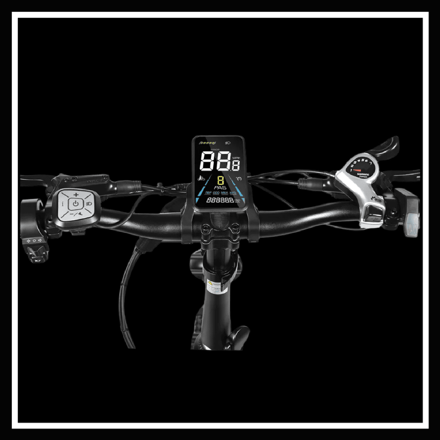 alt_tag: SAMEBIKE XWLX09 II electric bike handlebar display with controls and speedometer.