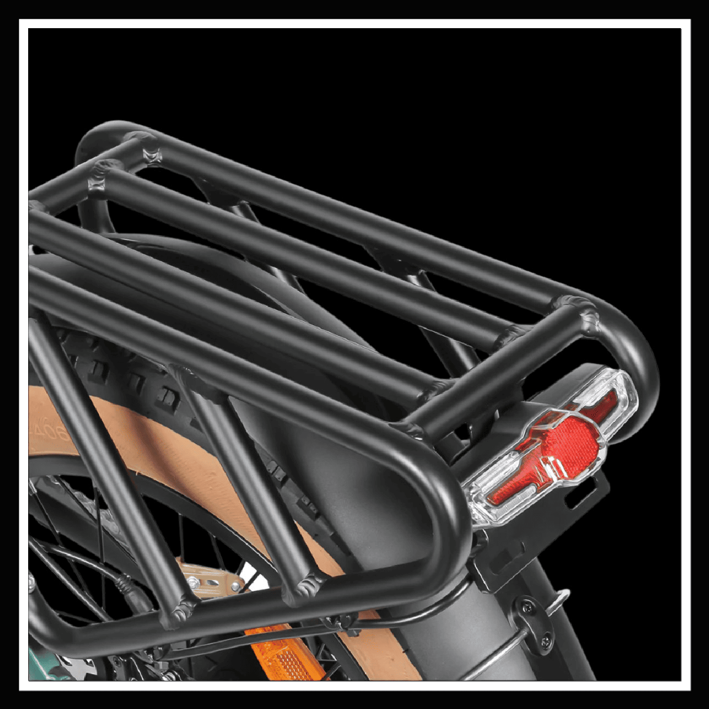 alt_tag: Rear view of the rack and tail light on the ๐Ÿ‡ฎ๐Ÿ‡ช๐Ÿ‡ช๐Ÿ‡บ๐Ÿ‡ฌ๐Ÿ‡ง SAMEBIKE XWLX09 II electric bike.