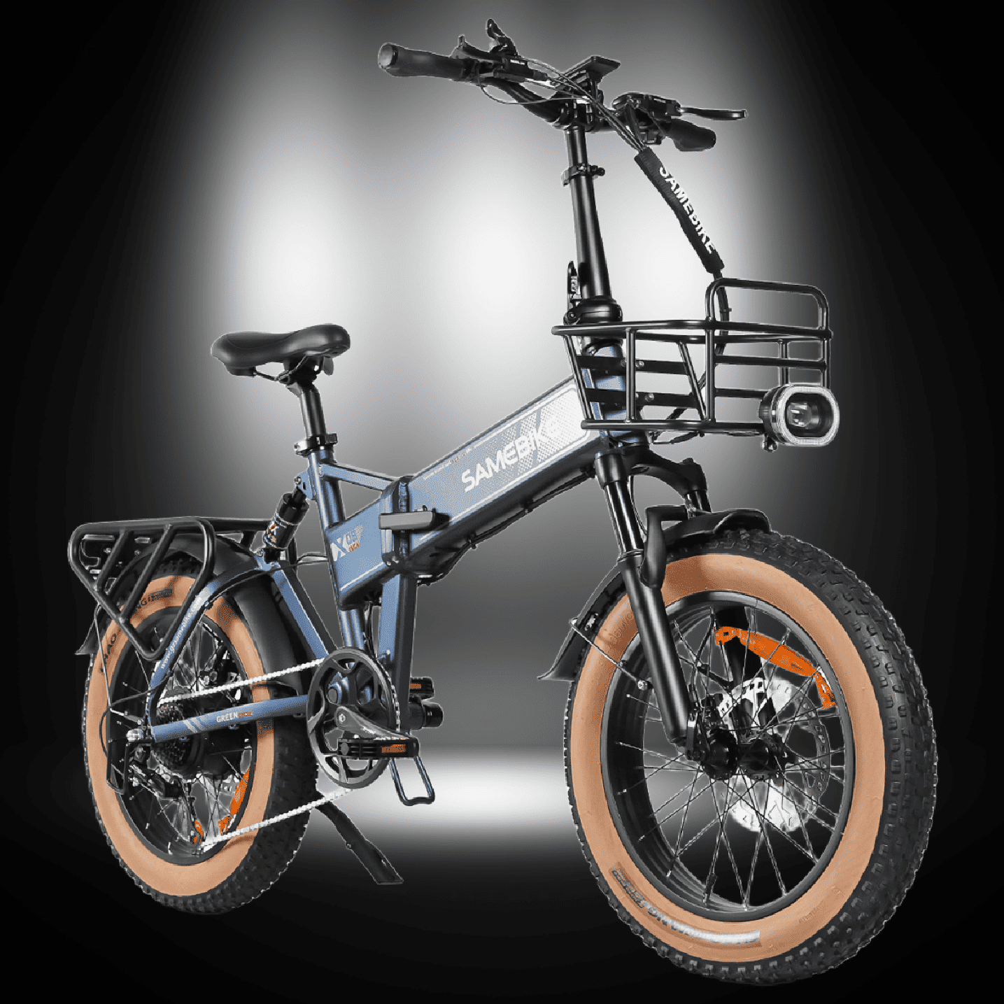 SAMEBIKE XWLX09 II electric bike with a foldable design and basket under a spotlight.