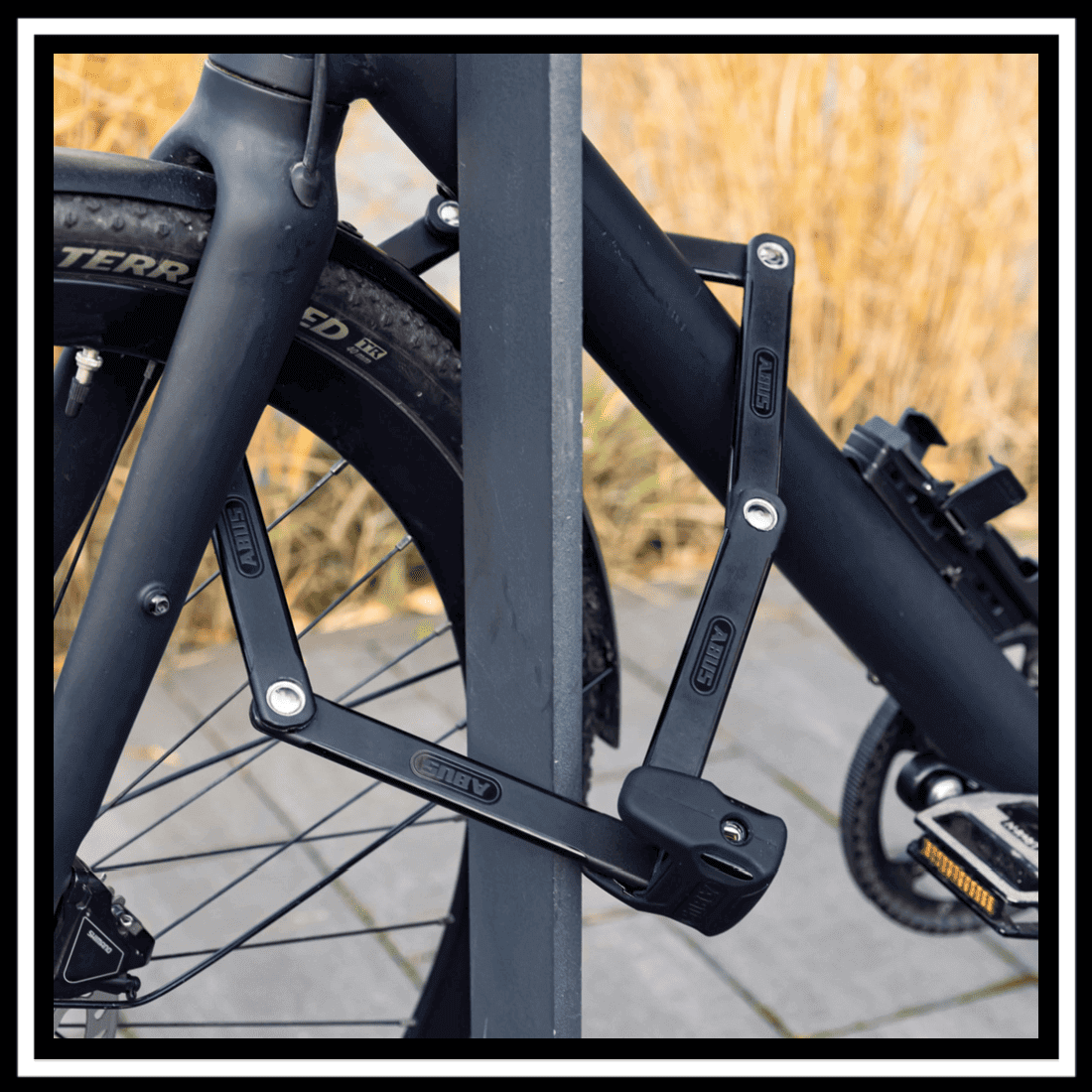 ๐Ÿ‡ฎ๐Ÿ‡ช๐Ÿ‡ช๐Ÿ‡บ ABUS BORDO BIG 6000K/90/120 folding lock securing a bicycle to a post for ultimate security.