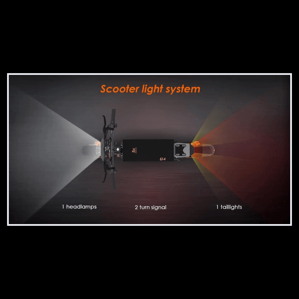‣ 4 POWERFUL LIGHTING SYSTEM |They are equipped with three LED lights at the front and rear. In addition to the main headlights at the front, there are two turn signals for auxiliary lighting. At the rear, in addition to the brake lights on the rear wing, there are two turn warning lights. 4 LED lights ensure safe driving at night; the front and rear brake lights will flash when turning, and the tail lights will flash when braking.