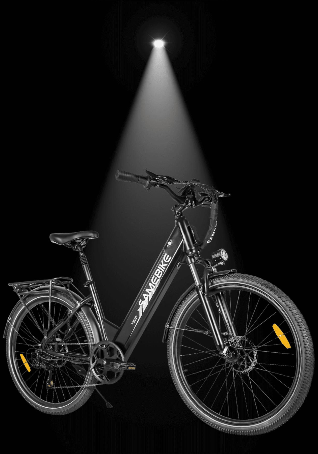 SAMEBIKE RS-A01 PRO electric bicycle under spotlight, showcasing sleek design for city commuting.