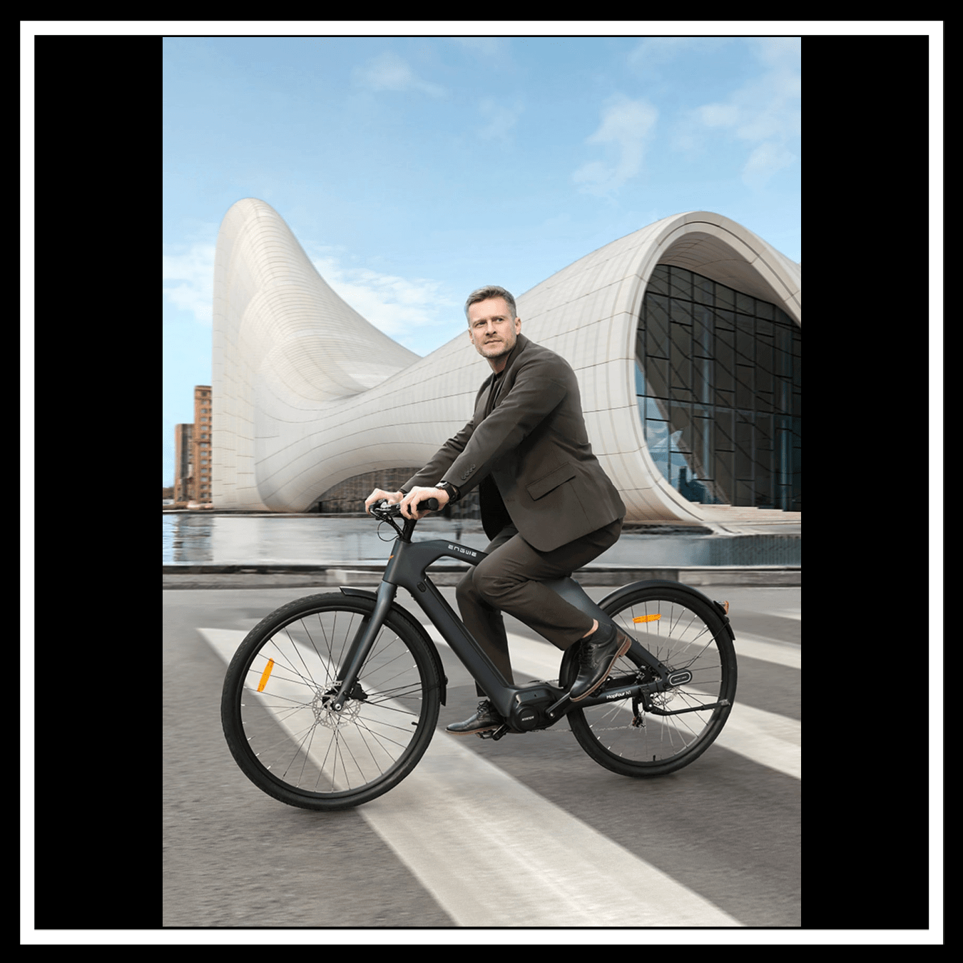 Man in a suit riding the ๐Ÿ‡ฎ๐Ÿ‡ช๐Ÿ‡ฌ๐Ÿ‡ง๐Ÿ‡ช๐Ÿ‡บ ENGWE MAPFOUR N1 PRO e-bike in an urban setting.