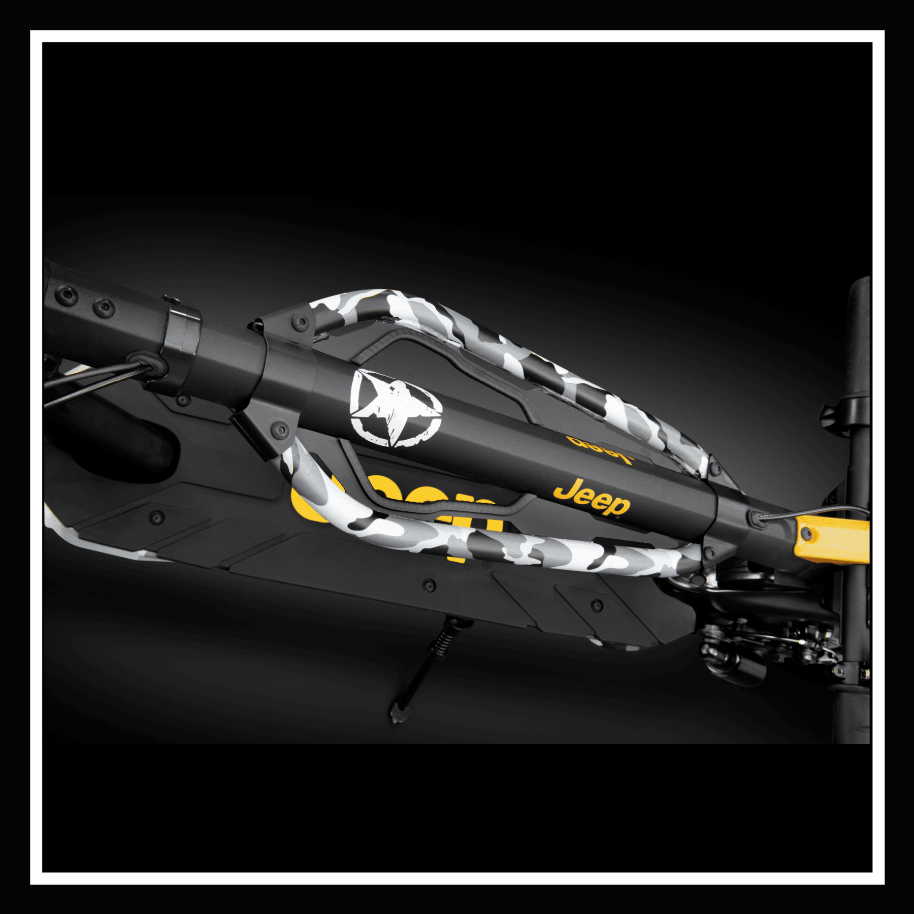 Close-up view of the ๐Ÿ‡ฎ๐Ÿ‡ช JEEP 2xe URBAN CAMOU electric scooter deck with logo.
