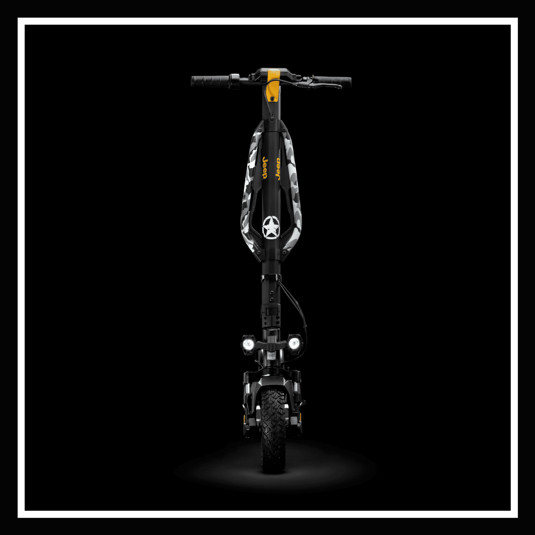 Jeep Electric Scooter front view showcasing durable design and sturdy tires, featuring ๐Ÿ‡ฎ๐Ÿ‡ช JEEP 2xe URBAN CAMOU.