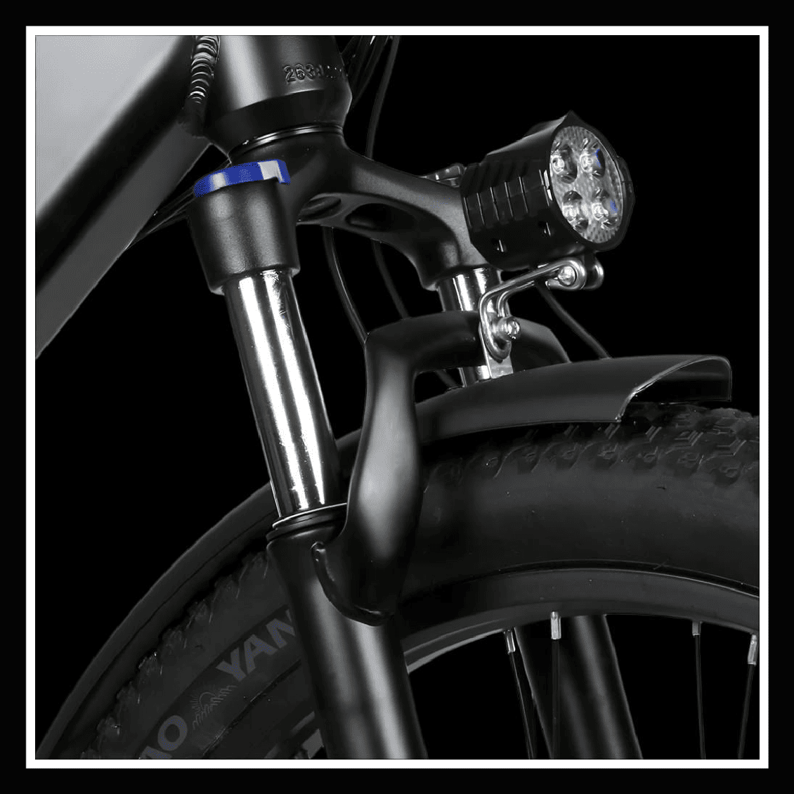 Close-up of the front fork and headlight of the SAMEBIKE RS-A01 PLUS Electric City Bike.
